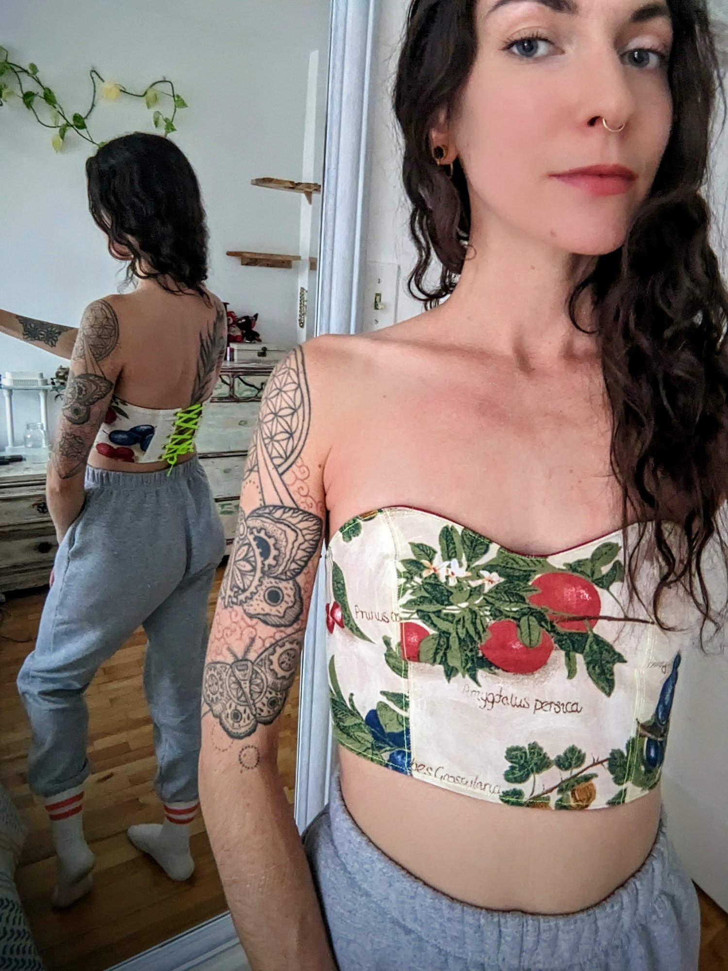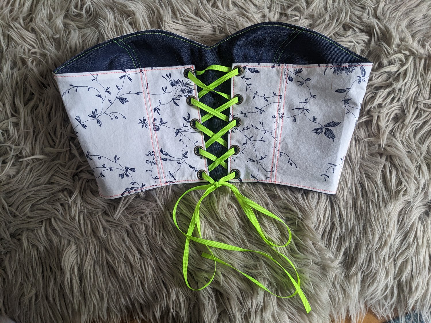 Made out of second hand, leftover or vintage fabrics this little corset style top is a TWO in ONE as it is reversible! With contrast stitching in neon thread its a past meets future vibe that can be dressed in so many ways! Can have the lace up back in neon yellow or white. If you prefer white, please write that in the notes section at check-out!