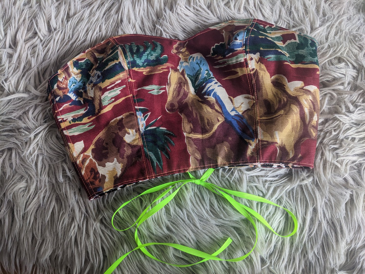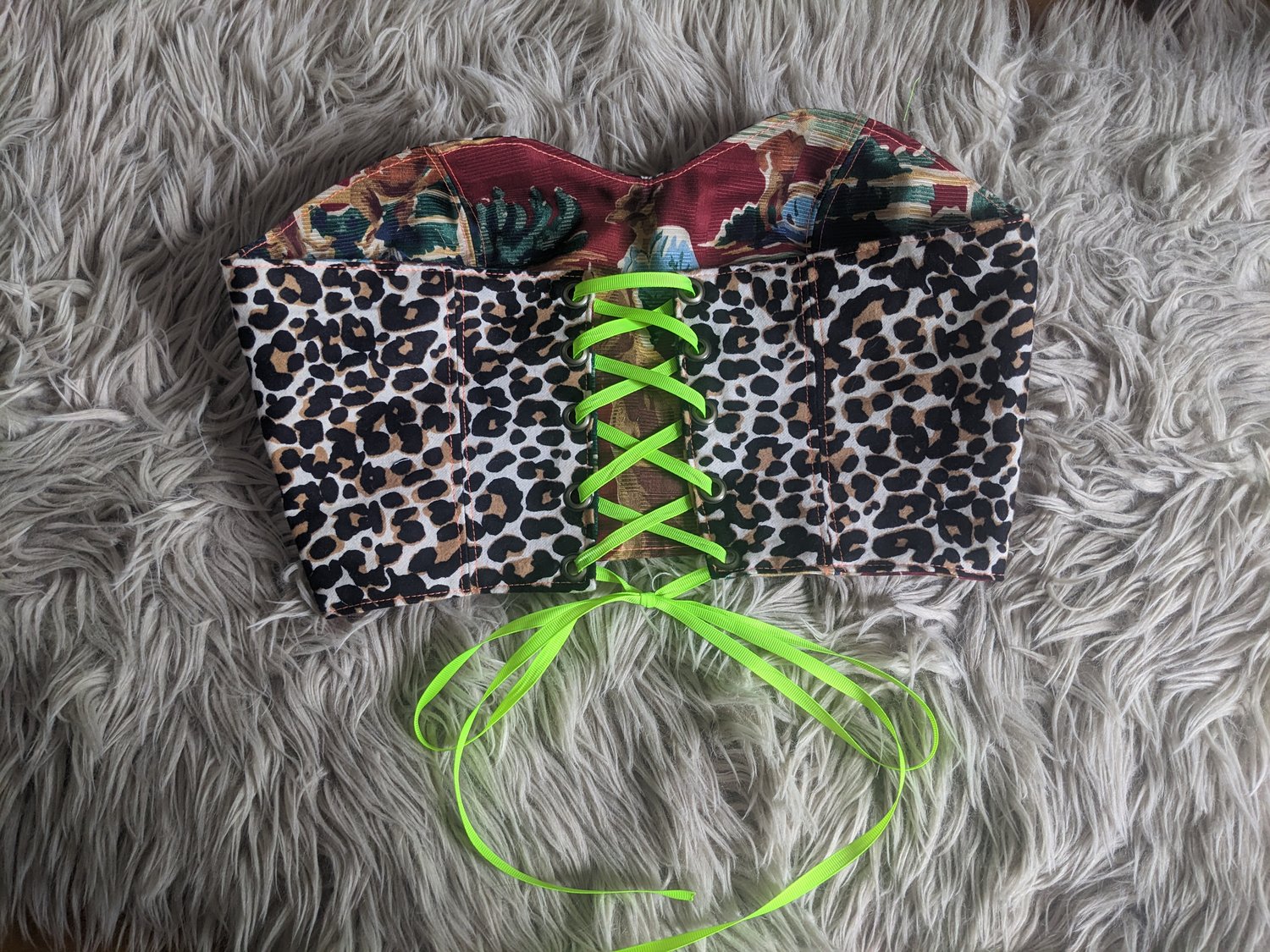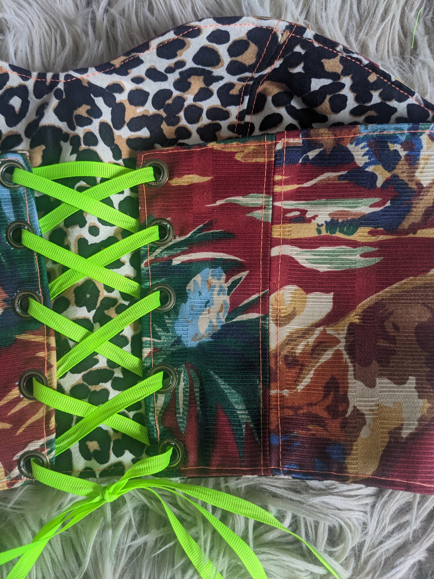 Made out of second hand, leftover or vintage fabrics this little corset style top is a TWO in ONE as it is reversible! With contrast stitching in neon thread its a past meets future vibe that can be dressed in so many ways! Can have the lace up back in neon yellow or white. If you prefer white, please write that in the notes section at check-out!